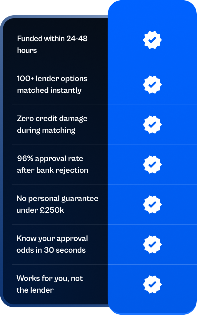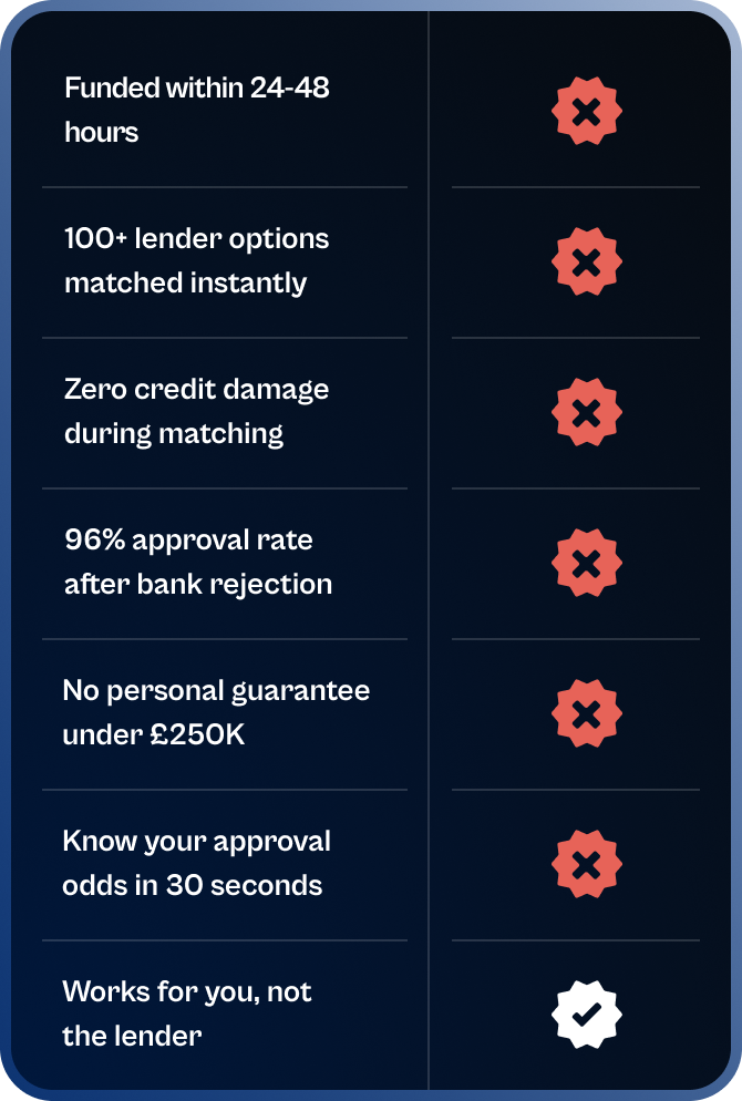 We've connected over 1,200 UK business owners with funding through our network of 100+ leading British financial institutions - including £20m in the last year alone. We know exactly which lenders fund which businesses, which criteria actually matter, and how to match the right business with the right partner in under 30 seconds.